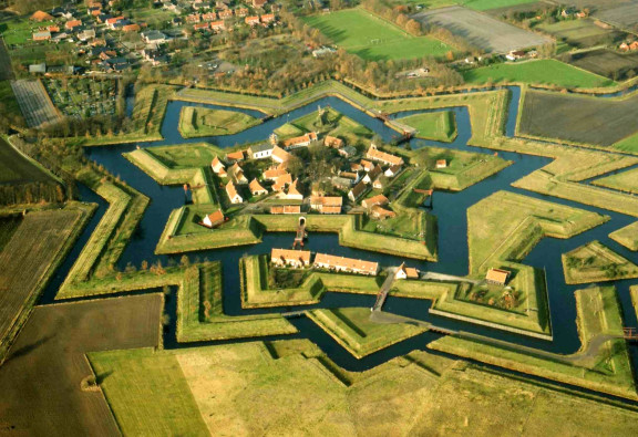 Bourtange liegt in der Provinz Groningen und ist eine der wenigen Festungen in Europa, die nach ihrem fast vollständigen Verfall in den letzten Jahrzehnten komplett wieder aufgebaut wurden einschließlich der Wälle, Gräben und rot bemalten Zugbrücken. Viele der Gebäude, die es damals gab, können heute noch im Inneren besichtigt werden wie Schule, Kirche und Mühle.